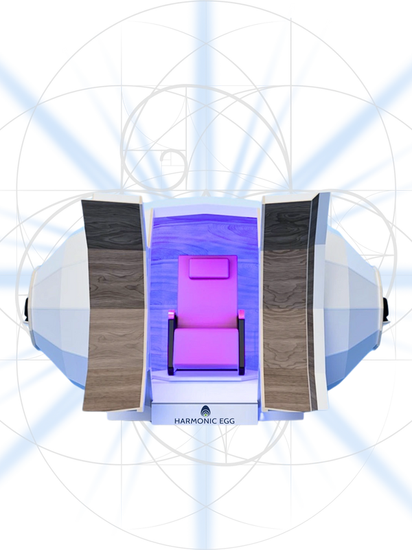 Within the sacred geometric chamber, carefully curated music frequencies and color selections help guide you into a state of profound relaxation. Reclining in a zero-gravity chair, you are enveloped in sound waves and light, customized to your intention.